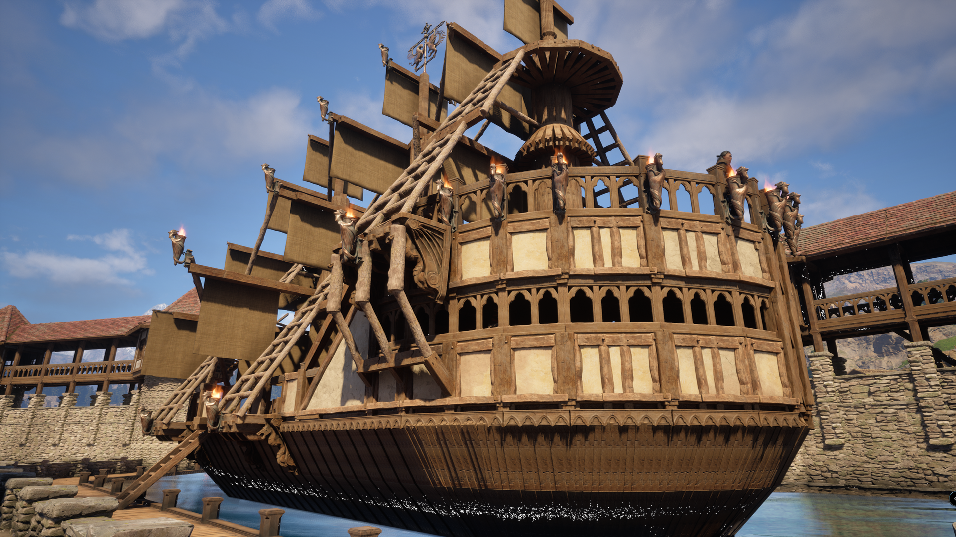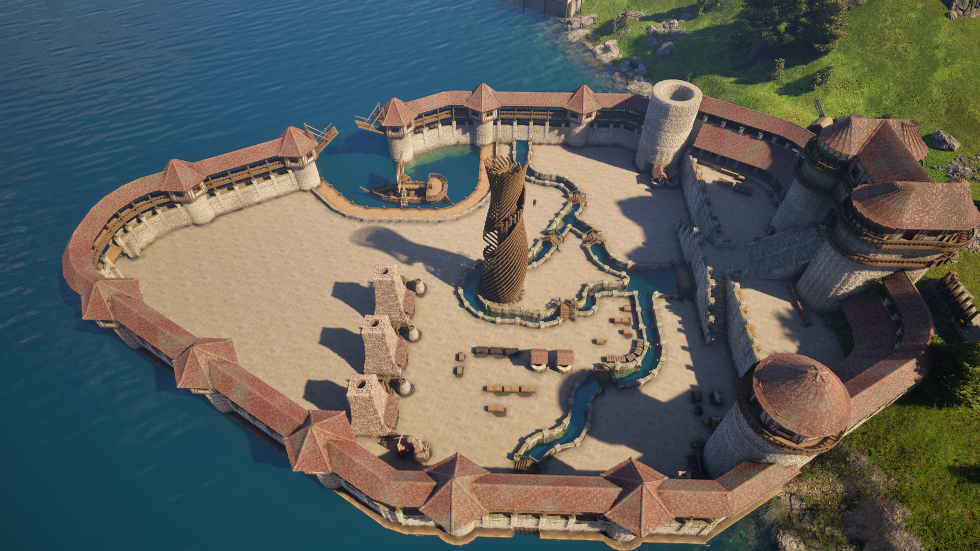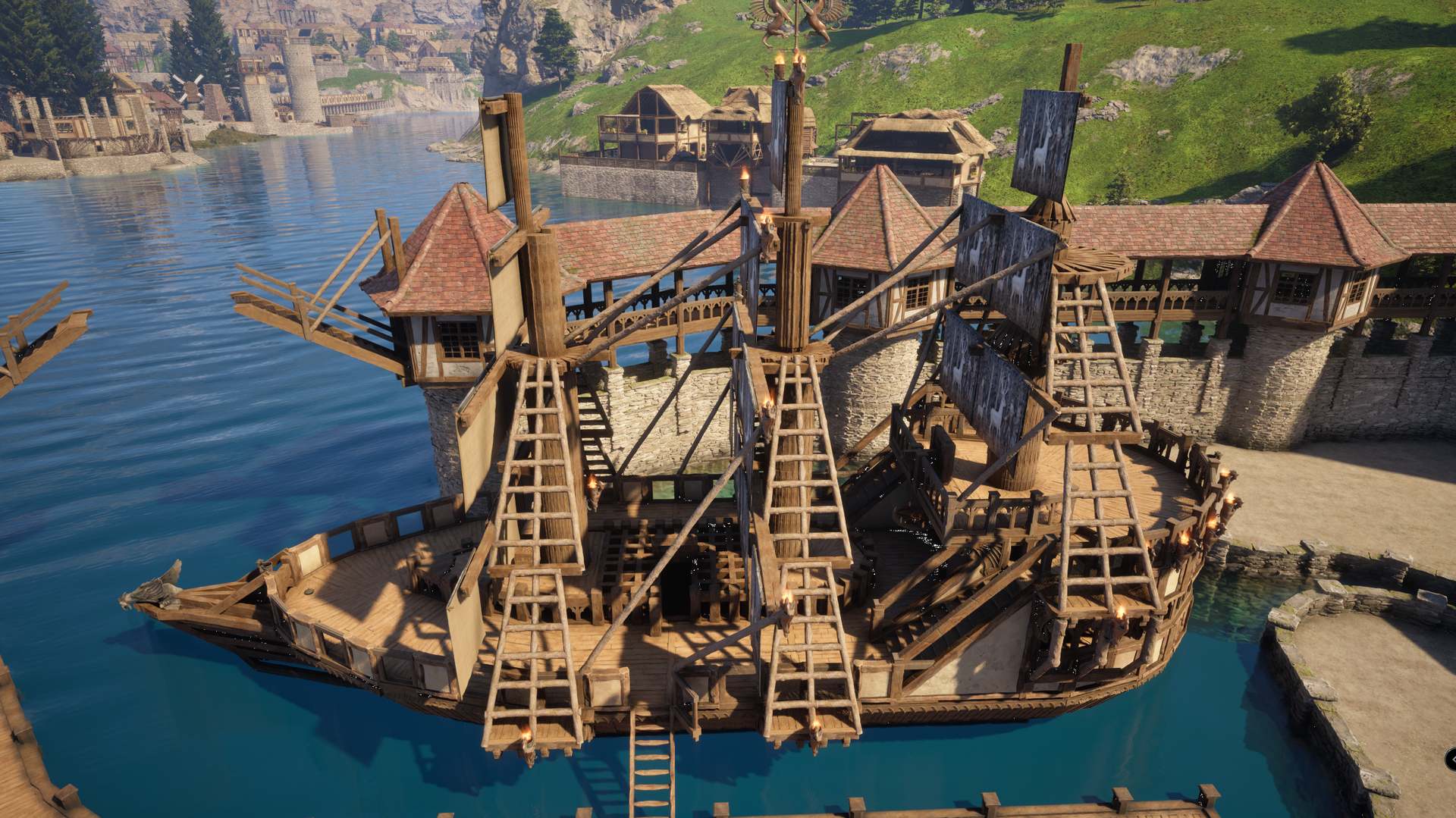 weder das hotel noch der kerker steht XD aber das schiff und der hafen wurden vergrößert ! soll ein piraten schiff werden .... mal sehen was draus wird -